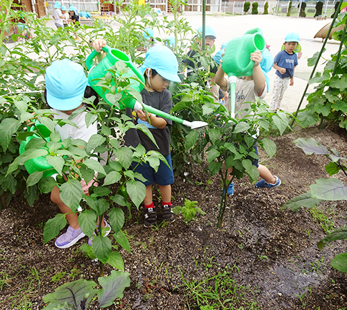 - 種をまいたり苗を植えたり世話をし、野菜の生育を見守ります。その中で不思議さを感じ、見たり、触ったりして楽しみながら食への興味・感心を育みます。